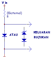 Gambar 1.b. Penyedia tegangan rujukan konfigurasi seri Pemilihan Peranti Penyedia Tegangan RujukanPemilihan peranti penyedia tegangan rujukan dapat dilakukan dengan baik bila dipahami spesifikasi peranti dan maknanya seperti tercantum dalam lembar data peranti. Beberapa parameter yang biasanya dicantumkan dalam lembar data peranti rujukan tegangan antara lain adalah:1. Akurasi Istilah akurasi sebenarnya rancu. Secara harafiah, akurasi adalah keseluruhan penyimpangan nilai dari nilai keluaran idealnya, yang dinyatakan dalam prosentase. Tegangan rujukan yang sempurna adalah yang 100% akurat. Tetapi, dalam istilah yang umum digunakan, istilah akurasi dan galat total (total error) sering dipertukarkan maknanya. Tegangan rujukan yang 1% akurat biasanya dipahami sebagai memiliki galat total 1% bukan 99%.2. Galat (Error) Galat merupakan ukuran penyimpangan dari nilai ideal atau nilai seharusnya. Galat tegangan rujukan dinyatakan dalam besaran nilai mutlak (misalnya, sekian milivolt), dalam besaran prosentase (%), atau bagian per sejuta (ppm, part per million).3. Akurasi Awal Akurasi awal (initial accuracy) adalah toleransi tegangan keluaran yang dihasilkan oleh peranti penyediaan tegangan rujukan setelah catu daya dinyalakan (turn-on). Nilai akurasi awal biasanya diukur saat tidak ada beban atau pada rentang beban tertentu. Dalam banyak aplikasi, akurasi awal merupakan spesifikasi paling penting, bahkan peranti penyedia tegangan rujukan kualitas rendah hanya akan mencantumkan akurasi awalnya saja.4. Hanyutan Penyalaan Hanyutan penyalaan (turn-on drift) adalah perubahan tegangan keluaran pada interval waktu tertentu setelah catu daya dinyalakan. Hal ini berbeda dengan akurasi awal yang jarang dinyatakan pada rentang waktu tertentu, meskipun untuk peranti elektronika modern umumnya diperlukan waktu sekitar beberapa milidetik untuk penstabilan (khusus peranti dengan pemanasan subtrat, yang memerlukan beberapa detik waktu penstabilan). Peranti penyedia tegangan rujukan pada umumnya menunjukkan perubahan tegangan keluaran pada detik atau menit pertama setelah penyalaan. Hanyutan penyalaan merupakan parameter penting pada sistem portabel untuk menghemat energi batere dengan cara mencatu peranti penyedia tegangan rujukan dalam waktu yang singkat.5. Hanyutan Jangka Pendek Hanyutan jangka pendek (short-term drift) didefinisikan sama dengan hanyutan penyalaan, tetapi dinyatakan dalam rentang waktu pendek (dari milidetik sampai beberapa menit) pada sembarang waktu setelah catu daya terpasang. Sama seperti derau (noise) hanyutan jangka pendek biasanya kecil, tak teramalkan, dan bersifat acak.6. Hanyutan Jangka Panjang Hanyutan jangka panjang (long-term drift) adalah perubahan yang lambat dari keluaran peranti penyedia tegangan rujukan yang terjadi dalam rentang waktu tertentu pada operasi kontinyu. Hanyutan jangka panjang yang biasanya dinyatakan dalam ppm/1000-jam, merupakan salah satu bentuk derau dan karenanya berbentuk acak dan tak teramalkan. Parameter ini biasanya diukur terhadap peranti-peranti sampel yang dipilih secara acak, karena pengukuran dan pengujiannya membutuhkan waktu yang sangat lama.7. Penuaan (Aging) Penuaan adalah perubahan tegangan keluaran bertahap yang disebabkan oleh perubahan karakteristik tegangan rujukan dalam jangka panjang. Berbeda dengan hanyutan jangka panjang, penuaan menghasilkan perubahan tegangan rujukan yang bersifat satu arah sedangkan hanyutan jangka panjang menyebabkan perubahan yang bersifat fluktuatif dan acak.8. Derau Derau (noise) elektrik merupakan keluaran tidak dikehendaki pada terminal keluaran peranti penyedia tegangan rujukan. Derau ini meliputi derau termal pita-lebar (wideband), derau paku (spike) frekuensi rendah, dan derau 1/f pita-sempit. Derau termal biasanya kecil dan mudah difilter dengan jaringan RC, kecuali bila penggunaan jaringan RC tidak dikehendaki karena dapat mempengaruhi kinerja sistem. Pada aplikasi yang hanya mencatu peranti penyedia tegangan rujukan dalam interval waktu singkat, kebanyakan bentuk derau berwujud komponen akurasi awal.9. Hanyutan Temperatur Hanyutan temperatur (temperature drift) adalah perubahan tegangan akibat perubahan temperatur, yang dinyatakan dalam ppm/° C atau %/° C. Hanyutan temperatur merupakan parameter penting kedua setelah akurasi awal, dan menjadi dominan untuk aplikasi yang akurasi awalnya dapat dikompensasi dengan mengkalibrasi penguatan. Kompensasi TemperaturTemperatur sangat mempengaruhi tegangan keluaran peranti penyedia tegangan rujukan. Salah satu upaya untuk mengatasi perubahan tegangan keluaran peranti penyedia tegangan rujukan adalah dengan menjaga agar temperaturnya stabil. Cara ini sangat sulit dan pada situasi tertentu mustahil dilakukan. Oleh karena itu, dikembangkan berbagai teknik untuk meminimalkan pengaruh temperatur terhadap perubahan tegangan keluaran peranti penyedia tegangan rujukan.1. Pemanas Temperatur Konstan Penstabilan tegangan dapat dilakukan dengan menempatkan peranti penyedia tegangan rujukan dalam pemanas yang temperaturnya dipertahankan konstan di atas temperatur ruangan (antara +50° C sampai +86° C). Cara ini memiliki kerugian karena temperatur yang tinggi mempercepat proses penuaan (aging) pada diode zener, memperperbesar hanyutan jangka panjang, dan mengurangi usia harapan pakai (life expectancy).2. Resistor Koefisien Temperatur Positif Termistor atau resistor koefisien temperatur positif, yang dipasang secara seri atau paralel dengan resistor dan ditempatkan pada jaringan umpan balik penguat penyangga, dapat mengkompensasi temperatur peranti penyedia tegangan rujukan dengan cara mengubah tanggapan penguat sesuai dengan temperatur. Kompensasi temperatur dapat dicapai optimal apabila termistor ditempatkan sedekat mungkin dengan peranti penyedia tegangan rujukan.3. Diode Diode konvensional yang dipasang seri dengan zener tegangan rujukan dapat memperkecil koefisien temperatur zener. Kompensasi dengan cara ini dapat dicapai optimal jika diode kompensator cocok (match) kara