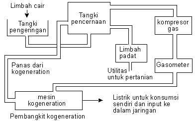 Sedangkan yang banyak menggunakan cogeneration adalah Inggeris di mana sampai saat ini saja sudah mencapai sekitar 5% dari total kebutuhan listriknya dipasok oleh cogeneration. Jika pembangkit cogeneration ini dihubungkan ke jaringan interkoneksi maka pembangkit itu sudah tidak menjadi kebutuhan sendiri atau telah menjadi komersial. Hal ini jika terjadi kelebihan energi listrik maka energi itu bisa dijual ke konsumen dan sebaliknya pada saat beban puncak maka pembangkit cogeneration membutuhkan beban yang bisa diambil dari sistim interkoneksi. Suatu pembangkit skala kecil yaitu dengan ukuran 1 MW terdiri dari mesin, generator, pemanas, sistim pembuangan unit pemanas dan unit kontrol dan unit-unit itu dibuat secara kompak. Cogeneration itu bisa menggunakan bahan bakar gas alam dan biogas dari limbah. Unit cogeneration itu dibuat dengan teknologi canggih di mana pada key board komputernya tersedia fungsi kontrol dan monitoring. Fungsi kontrol dimaksudkan untuk menyalakan mesin dan sinkronisasi generator sesuai dengan output yang dibutuhkan. Sedangkan unit monitoring dimaksudkan untuk keamanan unit dan untuk mempridiksi perawatan yang diperlukan. Cogeneration skala kecil itu cocok di tempatkan pada daerah yang memerlukan panas dan listrik. Untuk itu berarti bisa ditempatkan di rumah sakit, tempat hiburan dan perumahan. Cogeneration Mesin DieselMesin Diesel mempunyai efisiensi termal yang relatif tinggi. Di mana panas yang keluar dari mesin diesel terutama dalam bentuk gas yang dihabiskan dan energi termal yang dibawa oleh air selubung mesin. Pada beban yang penuh mesin diesel mempunyai keseimbangan panas.Panas yang dikeluarkan mesin diesel semuanya bisa dimanfaatkan misalnya