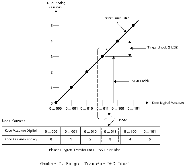 2. Fungsi Transfer Ideal Konverter Digital-ke-AnalogKonverter digital-ke-analog (DAC, digital-to-analog converter) merepresenta-sikan sejumlah kode masukan digital diskrit dengan sejumlah nilai keluaran analog diskrit. Karenanya, fungsi transfer DAC adalah sederet titik-titik diskrit sebagaimana ditunjukkan pada gambar 2.Untuk DAC, 1 LSB adalah tinggi undak (step height) antara dua keluaran analog yang berdekatan. Secara sederhana, DAC dapat dibayangkan sebagai potensiometer terkendali secara digital yang keluarannya merupakan bagian dari tegangan analog skala-penuh, bergantung pada kode masukan digitalnya. 3. Kesalahan (Galat) StatikKesalahan statik adalah kesalahan (galat) yang mempengaruhi akurasi konverter bila konverter tersebut mengkonversi sinyal statik (DC, direct current). Yang termasuk dalam jenis galat statik adalah galat offset, galat bati (gain error), non-linieritas integral, dan non-linieritas diferensial. Masing-masing galat dapat diekspresikan dalam unit LSB atau kadang-kadang sebagai prosentase dari FSR. Misalnya, galat ½ LSB untuk konverter 8-bit adalah sama dengan 0,2% FSR.