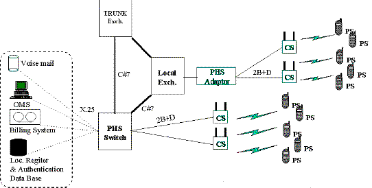 Arsitektur jaringan PHS bila digunakan secara optimal, terdiri dari 4 elemen utama, yaitu PHS Switch, Cell Site (CS), PHS Adaptor dan Personal Station (PS).