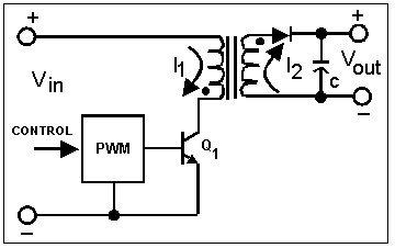 Salah satu topologi dari power supply tipe switching adalah dengan metoda flyback (flyback regulator) seperti yang diilustrasikan pada Gambar 3. Pengaturan besarnya daya keluaran melalui komponen switch dikendalikan dengan metoda modulasi lebar pulsa atau PWM (Pulse Width Modulation) dimana semakin lama switch berstatus ON semakin banyak energi yang disimpan dalam transformer dan semakin besar pula daya yang dikirim ke beban. Selain itu, untuk menghasilkan tegangan keluaran yang stabil, maka tegangan tersebut dapat diumpan balik dan dibandingkan dengan tegangan referensi (reference voltage) dan selisihnya kemudian dapat digunakan untuk mengendalikan lamanya switch berstatus ON dan OFF. Pada gambar 4, dapat dilihat konfigurasi lengkap dari metoda Flyback tersebut. Sebutan lain power supply tipe switching adalah tipe "off-line" karena tegangan DC yang menjadi masukan adalah melalui proses penyearah langsung dengan penyearah Bridge dari sisi AC atau dari jaringan listrik dengan tanpa menggunakan transformer 50 atau 60 Hz. Pada rangkaian yang sama juga terlihat adanya sistim umpan balik yang harus terisolasi dari sisi AC dengan menggunakan transformer ukuran kecil ataupun dengan opto-isolator.