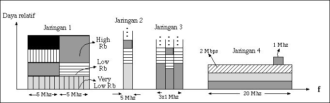 W = lebar pita transmisi (Hz) S = daya sinyal (Watt) N = daya derau (Watt) II. Konsep Multirate Radio InterfaceRadio akses sistem bergerak generasi ketiga harus mendukung skenario multioperator, dimana sejumlah operator jaringan yang berbeda berada dalam satu area yang sama menawarkan layanan yang berbeda-beda, dari beberapa kbps sampai dengan 2 Mbps. Untuk mendukung konsep ini dan mempermudah pengaturan alokasi frekuensi, maka sistem bergerak ini harus menerapkan multiple bandwidth kanal RF, dimana masing-masing jaringan menempati lebar pita yang berbeda. Di dalam proyek Code Division Testbed (CODIT), telah diteliti direct sequence CDMA (DS-CDMA) asynchronous dengan tiga kecepatan yaitu : Rc1 = 1,023 Mcps, Rc2 = 5,115 Mcps, dan Rc3 = 20,46 Mcps [2],[4]. Ketiga kecepatan chip tersebut menghasilkan lebar pita RF masing-masing sekitar 1 Mhz, 5 Mhz, dan 20 Mhz, dimana dinyatakan sebagai narrowband, mediumband, dan wideband kanal RF.Pentransmisian pada physical layer dengan menggunakan teknik pengkodean kanal, interleaving, dan spreading, mampu memetakan masing-masing kecepatan informasi, Rb, yang ditawarkan oleh sistem kedalam paling sedikit salah satu dari ketiga kecepatan tersebut. Untuk masing-masing layanan, parameter transmisi, yaitu : kecepatan coding, interleaving, kecepatan chip, faktor spreading, daya transmisi, dsb. diatur sehingga memungkinkan spesifikasi yang dibutuhkan untuk layanan tersebut dipenuhi. Jadi, coding dan faktor spreading Rc/Rb bervariasi terhadap kecepatan data informasi. Untuk lebar pita RF yang telah ditentukan, dalam hal ini kecepatan chip tetap, maka karakteristik loss akan bertambah dengan bertambahnya kecepatan bit informasi. Multirate radio interface DS-CDMA memungkinkan diterapkannya skenario multi operator. Hal ini ditunjukan oleh gambar.1. Operator jaringan, tergantung dari jenis layanan dan spektrum yang dibutuhkan dapat dialokasikan spektrum 1 Mhz, 5 Mhz, 20 Mhz, atau kelipatannya atau kombinasi dari ketiganya. Mediumband atau wideband dapat terdiri dari beberapa narrowband, seperti pada jaringan 1. Untuk jaringan yang luas, beberapa jaringan dapat menempati band frekuensi yang sama, seperti pada jaringan 4. Layanan dengan kecepatan rendah (suara) dapat diterapkan pada kanal narrowband maupun mediumband. Untuk telepon bergerak, kanal RF standart adalah 1 Mhz, tetapi bila menginginkan kualitas yang lebih baik dengan mengatasi diversitas multipath dan penginterferensi, dan mengijinkan operator untuk menerapkan ukuran cluster tunggal, maka dipergunakan kanal 5 Mhz Untuk layanan dengan kecepatan tinggi (diatas 64 kbps) membutuhkan kanal RF 5 Mhz atau 20 Mhz. III. Konfigurasi Jaringan Sistem Komunikasi Bergerak Generasi Ketiga Konfigurasi jaringan komunikasi bergerak generasi ketiga dapat dilihat pada gambar.2. Jaringan tersebut secara umum mempunyai fungsi yang sama dengan sistem generasi kedua, dimana PHS termasuk didalamnya. Terdapat empat kesatuan fungsi yang ditunjukan, yaitu : mobile station (MS), base station (BS), radio network controller (RNC) dan mobile control node (MCN). Sebuah MS dapat dihubungkan pada satu atau beberapa BS dan sejumlah BS berkomunikasi dengan RNC melalui satu interface. Sejumlah RNC dihubungkan ke jaringan fixed melalui MCN. IV. Perancangan ProtokolProtokol yang dikembangkan mengacu pada model referensi dari Open System Interconnection (OSI), seperti yang ditunjukan pada gambar.3 Arsitektur Protokol [3].Protokol dibagi kedalam dua bidang, yaitu : bidang pensinyalan, disebut C-plane, dan bidang data user, disebut U-plane. Kedua bidang dibagi kedalam physical layer (layer 1), data link layer (layer 2), dan network layer (layer 3, tak terdapat di U-plane). Layer 2 selanjutnya dipecah ke dalam dua bagian, data link control (DLC) dan medium access control (MAC). DLC berhubungan dengan pendirian jalur (link establishment), release dan maintenance, sedangkan MAC dipecah lagi menjadi upper sub layer yang terdapat di RNC dan lower sub layer yang berada di masing-masing BS. Pertukaran informasi antara MS dan RNC dilayani oleh RNC dan dikendalikan oleh kedua sub-layer ini. Pertukaran informasi ini antara lain : handover. Pertukaran informasi antara BS dengan MS ditangani oleh lower sub-layer. Pertukaran informasi BS-MS ini antara lain : channel coding, interleaving, dan control information.